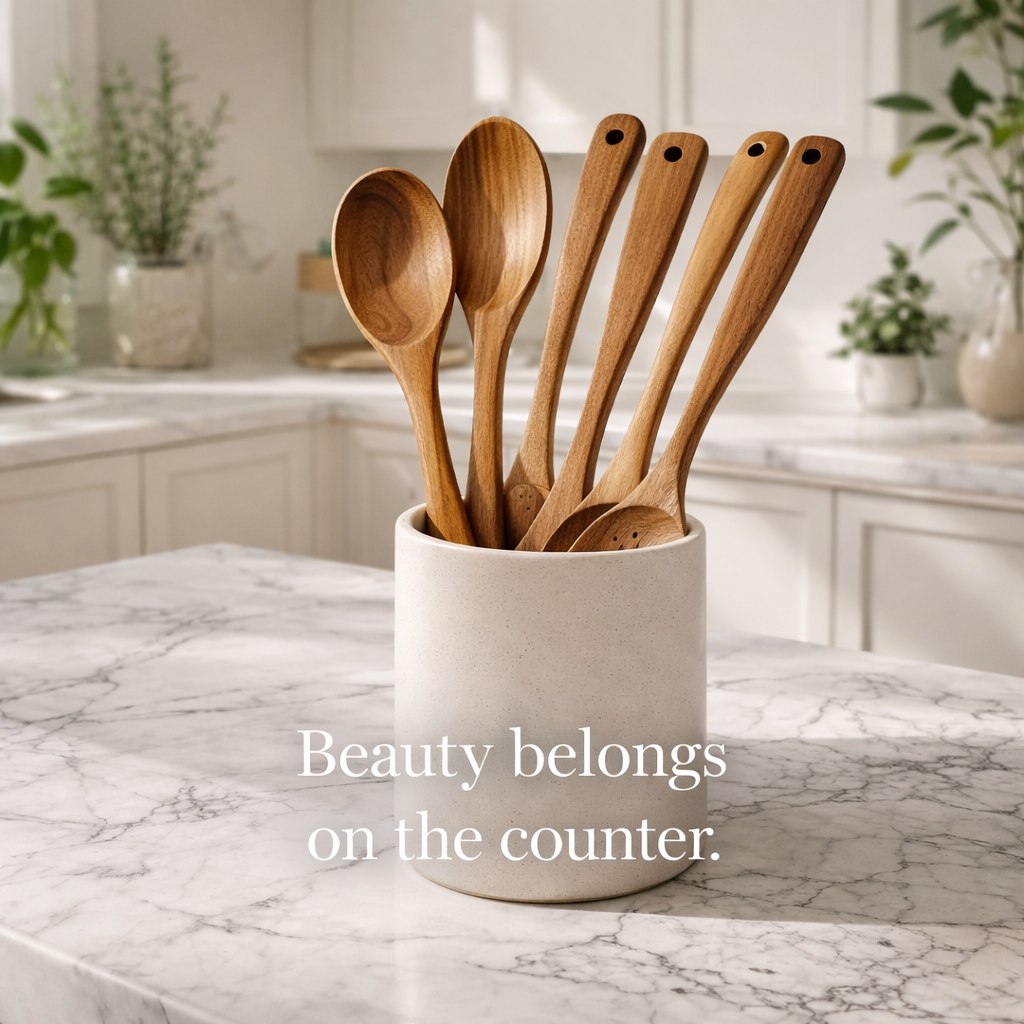 Our 6-piece Premium Teak Wood Utensil Set is different. It's crafted from 100% natural, chemical-free hardwood that never melts, never warps, and never releases harmful substances into your cooking.